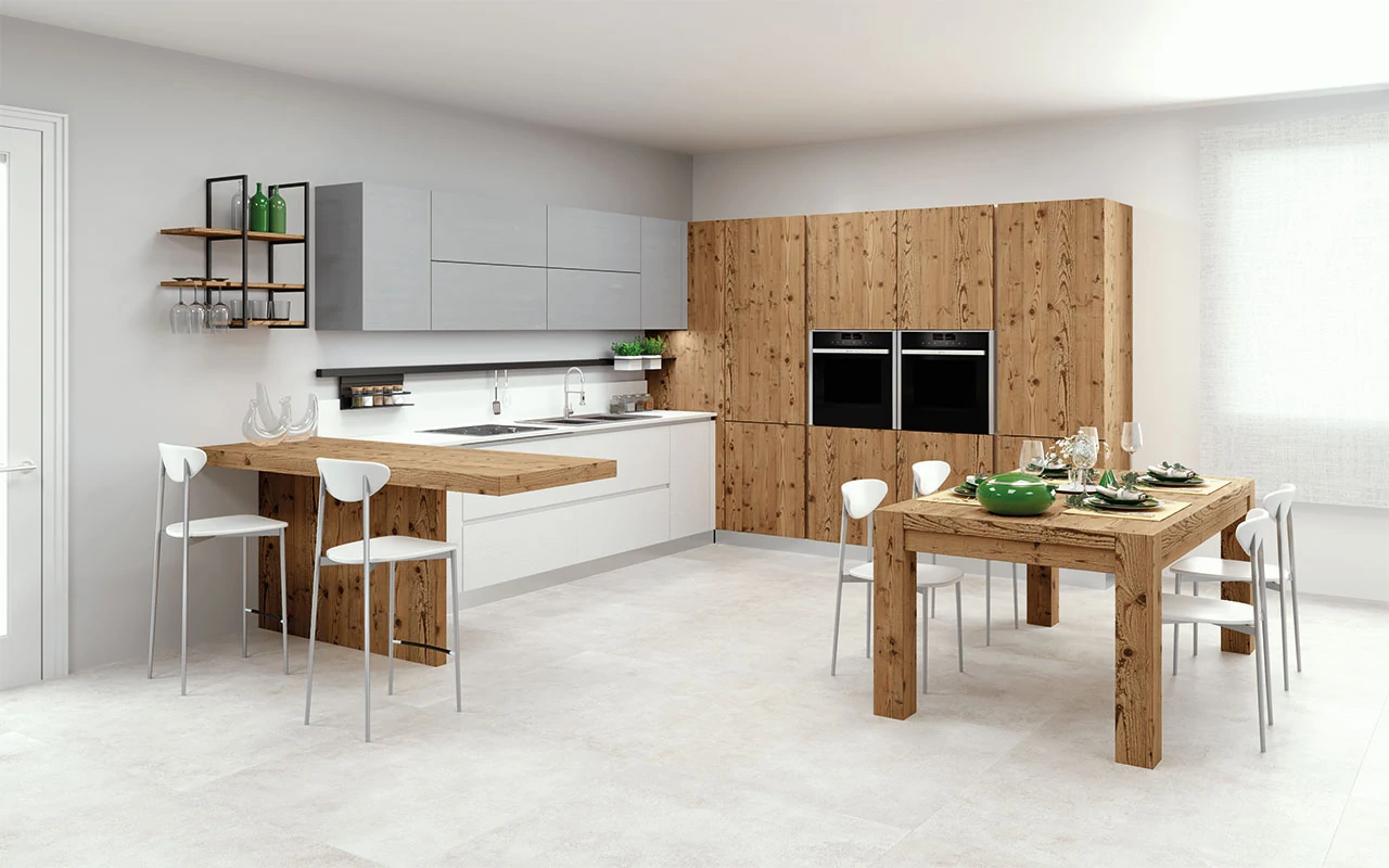 Tempora presenta Real, una composizione che unisce design e funzionalità mettendo a contrasto i materiali che la compongono, giocando tra il calore del legno vecchio e il rigore del bianco e del grigio. Il legno antico utilizzato è autentico, viene recuperato dai fienili vissuti del Cadore creando così ambienti unici ricchi di storia.