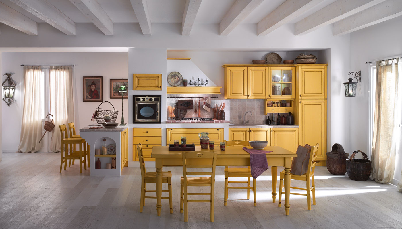Cucina tradizionale dal colore brillante e giocoso, con sala da pranzo.